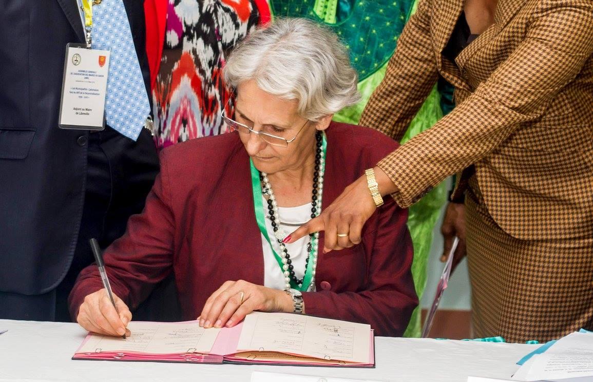 Maïté à la signature de la convention de lutte contre le sida engageant tous les maires du Gabon