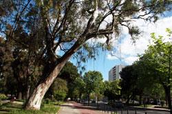 En zone urbaine, l'eucalyptus se développe tout aussi bien, car il a la capacité de résister à la pollution ambiante en rénovant son écorce, faculté comparable à celle du platane. En été, pendant les heures les plus chaudes, ses feuilles s'orientent parallèlement au soleil pour limiter leur évaporation, faculté positive pour l'arbre en lui-même, mais qui fait diminuer l'ombre qu'il pourrait proportionner. Ses racines profondes ne nuisent nullement aux chaussées, ni aux canalisations et à son développement maximal adulte, on peut reconnaître que son port est bien élégant. A Lisbonne, on ira voir ceux du jardin de la Fondation Gulbenkian pour s'en assurer, ou bien dans le jardin de Campo Grande avec deux ou trois espèces différentes, ou encore au jardin tropical de Belém également riche en eucalyptus de différentes sortes.