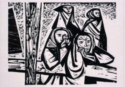 (Mulheres na lota (Femmes à la vente à la criée), 1952 - Linogravure sur papier © Fundação Júlio Pomar)