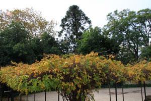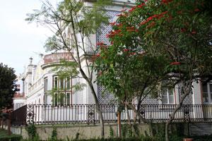 Une fois franchit le portail de l'entrée de la propriété, on constate au premier regard une végétation dense fournie par des arbres déjà bien développés, laissant difficilement pénétrer la lumière du jour. Comme espèces représentatives, nous y trouvons deux beaux platanes plus que centenaires (Platanus orientalis), une demi-douzaine de poivriers du Brésil (Schinus molle et S. terebenthifolius), un séquoia encore relativement jeune (Sequoia sempervirens), des palmiers de provenances multiples, tels les Washingtonia du Mexique et de Californie, le palmier à queue de poisson (Caryota mutis) de l'Inde, ce dernier étant imbriqué et cherchant la lumière dans l'énorme figuier d'Australie (Ficus macrophylla), un palmier au tronc gonflé par l'eau qu'il arrive à stocker (Jubaea chilensis), originaire du Chili, comme son nom d'espèce l'indique et enfin, des exemplaire de palmiers des Canaries, dont il ne reste pour certains que la base, car ils ont été coupés après avoir été victimes du charançon rouge, insecte dévastateur qui sévit à Lisbonne depuis deux à trois ans, sans que l´on trouve, semble-t-il, moyen de le stopper.