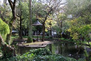 Une belle glycine (Wisteria chinensis) rend le parking plus attrayant, surtout au début du printemps quand elle se pare de ses fleurs en grappe violette parfumée. Autour du lac central, des frênes endémiques du Portugal (Fraxinus angustifolia), ainsi qu'un braquichiton d'Australie (Brachychiton populneus), ont les pieds dans l'eau, autant que la haie de bambous, là où des tortues aquatiques résident.