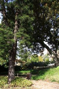 Comme autre représentant provenant de loin, appartenant à la flore d'Océanie et plus exactement à la Nouvelle-Calédonie, nous trouvons un araucaria (Araucaria columnaris) pourvu, chose insolite, de deux troncs inclinés, avec des branches peu développées, qui donnent cette impression de véritable colonne végétale. On l'appelle également "arbre de Cook", car c'est ce fameux capitaine anglais qui le signala en premier lors d'un de ses trois voyages dans le Pacifique.
