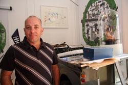 Miguel Palma est portugais, il a 47 ans et expose au Portugal, aux Etats-Unis, en Europe y compris en France (*) .Il vit et travaille à Lisbonne. Son univers est fait d´un mélange de peintures, d´installations mécaniques et multimédia, de vidéos, de maquettes, de dessins? Quand on sonne à la porte et que l´on rentre chez lui, on se demande si on pénètre dans un atelier, une maison ou une usine. Certainement un mélange savant des trois à la fois. Bref, un cabinet de curiosité à l´avant-garde de la modernité. Il fait partie de cette génération d´artistes portugais contemporains des années 90 qui ressentent le besoin d´interroger les objets et leurs fonctions afin de mieux cerner le sens du monde et de le retransmettre au public. Un explorateur de l´univers contemporain en parfaite harmonie avec son époque. Il nous confie qu´enfant puis adolescent il était déjà fasciné par la mécanique. Sa chambre puis toutes les pièces de la maison de famille furent envahies par une énergie créatrice précoce.