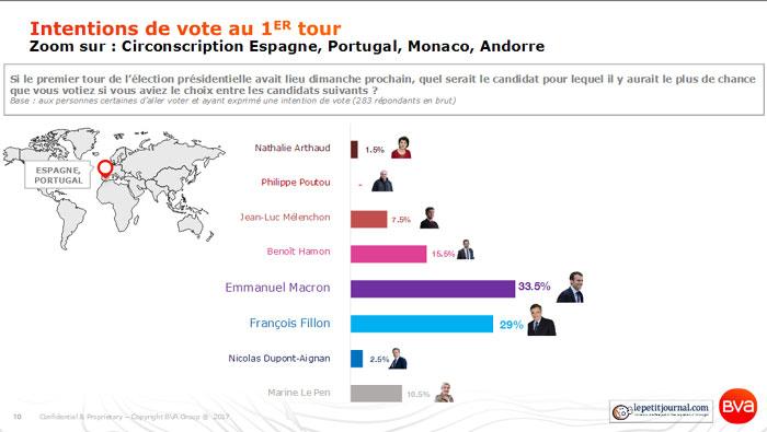 Sur la troisième marche du podium, avec seulement 13% des intentions de vote des Français de l'étranger, le PS représenté par Benoît Hamon perd la moitié de ses voix par rapport à 2012 (Hollande 28,5% au 1er tour). Cependant ce score grimpe à 23% chez les 18-34 ans (en deuxième position derrière Macron) et à 33% pour les cadres de la fonction publique. Jean-Luc Mélenchon est, quant à lui, crédité de 8% des suffrages, score identique à celui qu'il avait obtenu en 2012. Là encore, chez les 18-34 ans, ce score est bien meilleur, avec 15% des intentions de vote). Ce dernier bénéficie néanmoins d'un socle électoral plus solide que celui de Benoît Hamon, avec 67% de ses électeurs sûrs de leur choix.