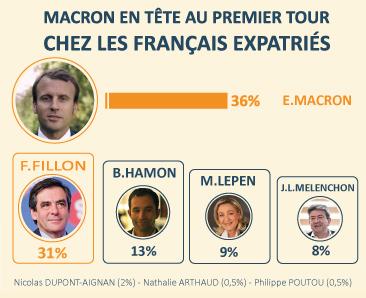 Avec 31% des intentions de vote. François Fillon fait mieux que résister. La droite traditionnelle cède un peu de terrain par rapport à 2012 (Sarkozy 38% au 1er tour), mais, sur la base d'un programme libéral, François Fillon résiste tout de même mieux hors de nos frontières qu'en France où les sondages le situent autour de 17%. Dans la circonscription Etats-Unis et Canada (ce sondage a été réalisé en partenariat avec frenchmorning.com), François Fillon arrive même en tête avec 36,5% des suffrages.