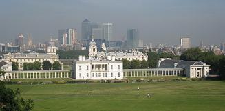 (Photo MB) - Vue de Greenwich : les buildings ultramodernes de Canary Whaf dessinent la ligne d'horizon. Au premier plan, les bâtiments du Royal Naval College datent du XVIIe siècle