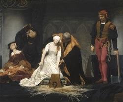 L'une des ?uvres les plus célèbres de Delaroche est sans conteste "Le supplice de Lady Jane Grey" ("The Execution of Lady Jane Grey"), datant de 1833. Jane Grey était l'une des petites-nièces d'Henri VII. Elle monta sur le trône, dont elle fut destituée une semaine plus tard par sa propre cousine Marie qui s'y installa à sa place. Jane Grey, surnommée "la Reine de neuf jours" par le peuple anglais, fut enfermée dans la Tour de Londres avant d'être décapitée en 1554. Elle n'avait que 17 ans. La toile de Paul Delaroche, empreinte de réalisme et d'émotion, nous montre une jeune femme aux yeux bandés qui tâtonne autour d'elle pour chercher le billot où elle trouvera la mort quelques minutes plus tard.