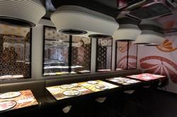 "Le concept est unique au monde", se targue la responsable des lieux. Effectivement, il est plus qu'original. A peine assis, on vous briefe: ne vous attendez pas à passer commande à un humain, ici tout se fait par écran tactile. Grâce à un système de projecteurs -dans l'esprit Austin Power, incrustés au plafond, le client choisit sa ?nappe? virtuelle parmi une vingtaine de décors et presqu'autant de coloris.