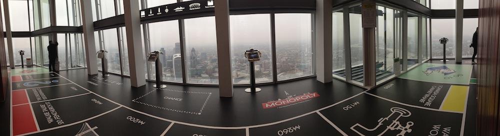 Un ascenseur puis un deuxième et hop ! nous voilà en quelques minutes au sommet de Londres. A l'occasion du lancement de ce Monopoly spécial London, la tour d'observation se transforme ainsi en plateau de jeu géant. Cases, cartes, pions, tout est à échelle humaine. Les monuments et infrastructures, que vous pouvez vous offrir grâce au jeu, ont un point commun ; elles sont visibles depuis le sommet de The Shard. Les joueurs pourront ainsi retrouver les lieux culturels emblématiques de la capitale. Une visite insolite qui offrira une vue impressionnante pour tous les curieux de passage à Londres.