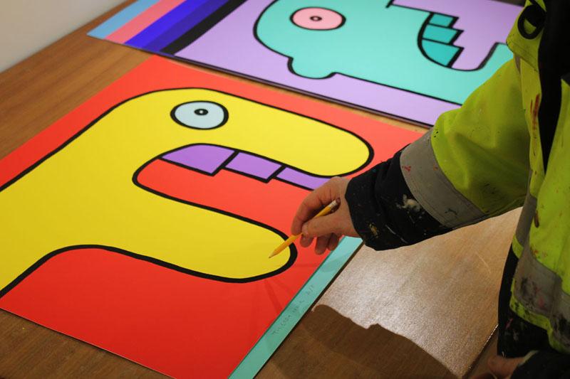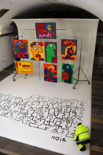 Nous avons eu la chance de rencontrer Thierry Noir la veille du grand jour, alors que tout reste encore à faire. En pénétrant dans l'antre de la Howard Griffin Gallery, on sent un brin d'angoisse, et surtout beaucoup d'excitation. Au fond de la pièce se monte, brique par brique, le "mur de Berlin". Puisqu'il est là où tout a commencé, il semblait impensable de réaliser cette rétrospective sans lui. "Le mur n'était pas comme ça", nous confie l'artiste en dévisageant le monstre qui prend peu à peu forme dans la salle. "J'aurais eu beaucoup plus de difficultés à peindre dessus s'il avait été fait de cette matière". Une chance, dira t-on, qui permet à Thierry Noir d'attraper ses pinceaux, et ne plus jamais les lâcher.