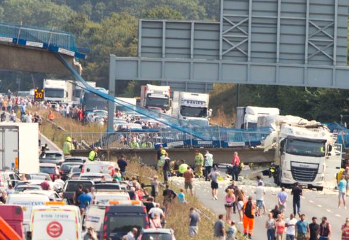 Il y a quelques jours, un poids lourd transportant un tractopelle a percuté un pont piéton sur l'autoroute M20, à une soixantaine de kilomètres au sud-est de Londres, provoquant l'écroulement de l'édifice sur un camion. Le bilan relève du miracle : un seul motard s'est blessé en se jetant au sol pour éviter la collision.