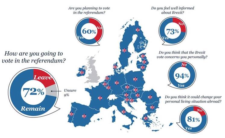 94 % des expatriés britanniques pensent que le Brexit les concerne personnellement et parmi ceux-ci, 9 personnes sur 10 déclarent que la sortie du Royaume-Uni de l'Union Européenne pourrait potentiellement changer leur situation personnelle à l'étranger. Par conséquent, 60 % des Britanniques résidant dans un pays européen, soit près de 1,3 million de citoyens, ont l'intention de voter. Parmi eux, 72 % sont pro-européens, un résultat 20 à 30 % supérieur à celui de la population britannique globale. En parallèle, ils ne sont que 19 % à souhaiter le retrait du Royaume-Uni de l'UE. L'euro-scepticisme n'a donc pas gagné les expats british !