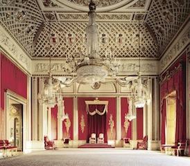 Une fois en haut, vous passerez une antichambre puis déboucherez directement dans la salle du Trône, l'une des magnifiques State Room que vous vous apprêtez à voir durant cette visite. Du sol au plafond, le ton est donné : cette pièce est royale ! Lorsque, deux siècles plus tôt, Georges IV en fait la commande à John Nash, son ambition est d'ailleurs d'impressionner ses invités. La salle est dominée par une rotonde sculptée, ornée des écussons d'Ecosse, d'Angleterre et d'Irlande tandis que de lourds lustres en cristal renforcent le prestige de l'ensemble. Enfoncé dans un coffre surplombé d'anges ailés, les deux trônes conçus pour Elizabeth II et le prince consort s'élèvent sur une estrade à plusieurs niveaux. Ce sont sur ces marches que l'on a vu s'étaler les traines des robes de mariées princières et les habits d'apparat de la Reine.