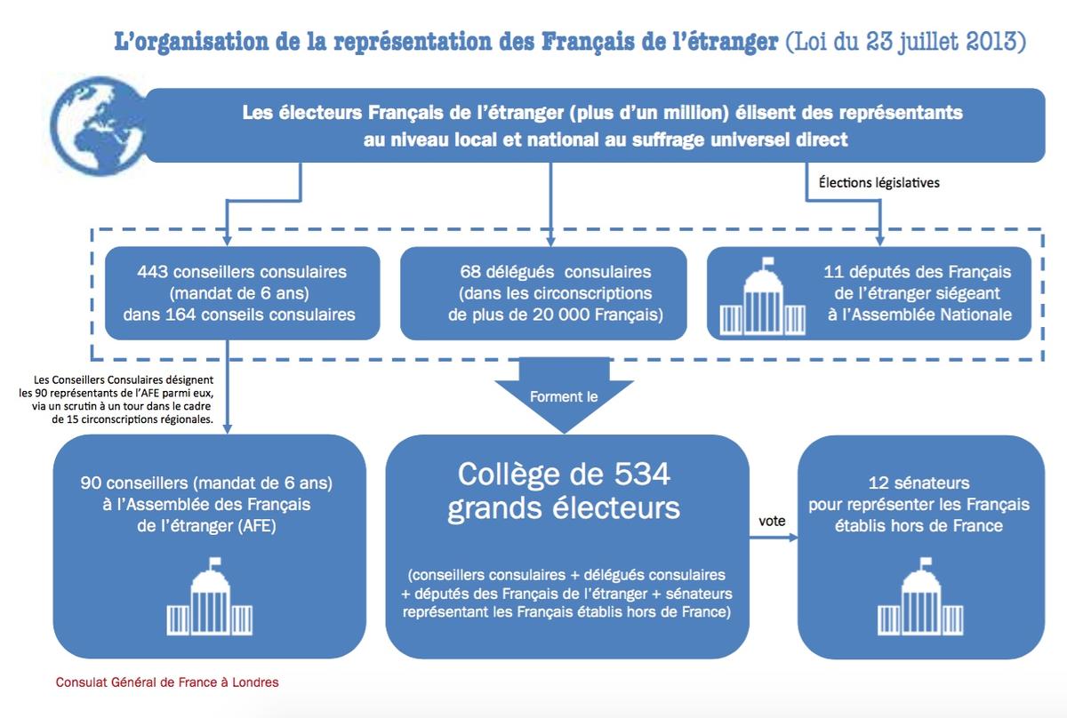Ils élisent les 90 conseillers à l'Assemblée des Français de l'Etranger ou AFE. Cette assemblée est notamment consultée sur le projet de loi de financement de la sécurité sociale pour les expatriés temporaires. Enfin, les 68 délégués consulaires, élus en même temps que les conseillers, sont des grands électeurs chargés d'élire les sénateurs.