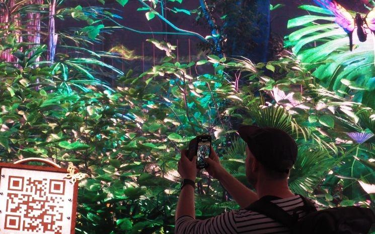 Après avoir scanné un QR code projeté sur les murs numériques depuis leur téléphone, les visiteurs ont accès à un portail à partir duquel ils peuvent faire apparaître des papillons en réalité augmentée et déclencher des animations en temps réel.