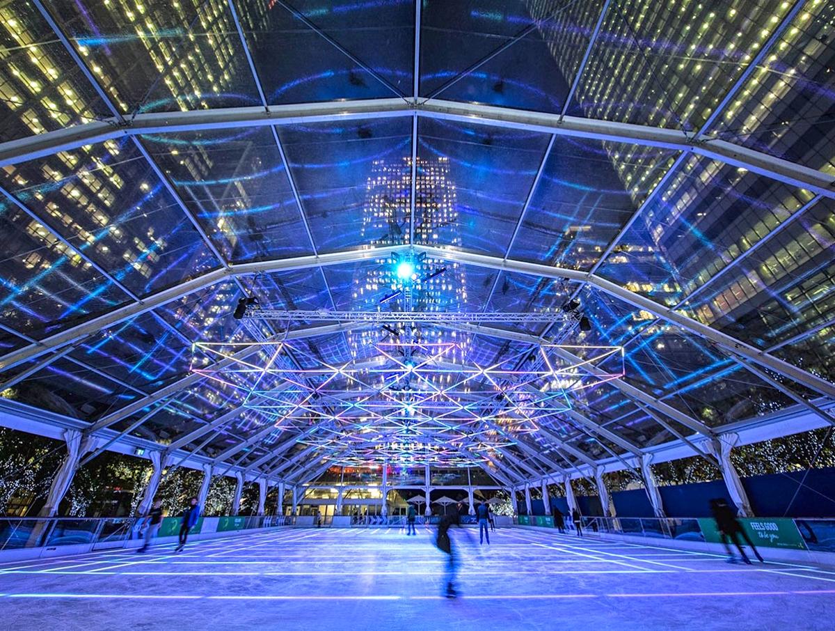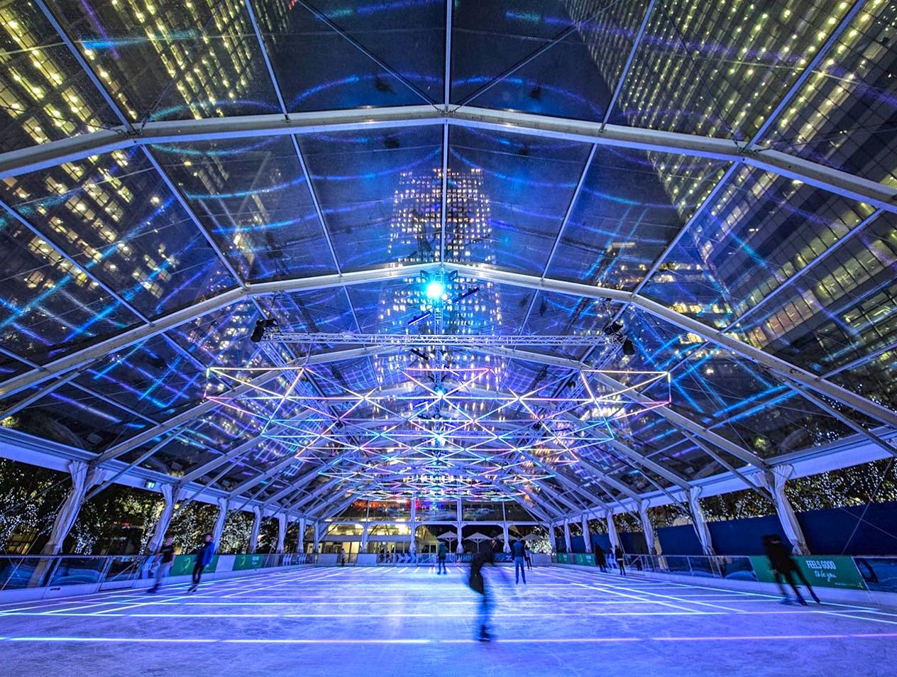 Située sur l'île aux chiens, dans les méandres de la Tamise, cette patinoire est entourée par les docks et les gratte-ciel, pour une ambiance nautique et paisible. Pour la première fois, elle respecte le thème « Lumino-City » : 8 km d'ampoules LED colorées, dans l'air et sous la glace, vous immergent dans un autre monde, à la fois futuriste et magique. Probablement la patinoire la plus luxueuse de Londres, avec son toit rétractable en cas de mauvais temps et sa terrasse chauffée pour siroter un vin chaud, accompagné d'une délicieuse gaufre belge, moelleuse à souhait.