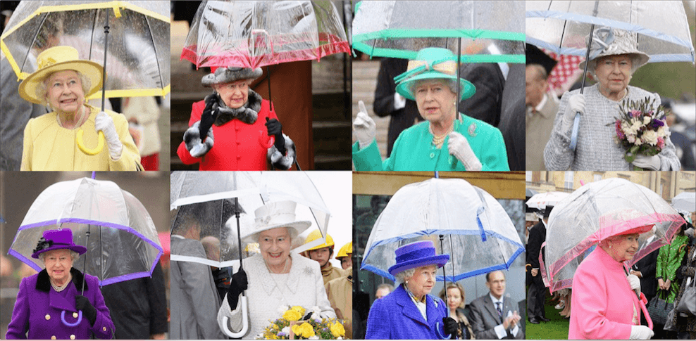 En attendant LE parapluie qui la défendra de tout, la Reine pourra emprunter celui de François Hollande, le ParaPactum. En plus d'être efficace? contre la pluie, il protège aussi contre les jets de pierres, d'acide, le feu, les tirs de fusil à plomb, mais ne peut remplacer un gilet pare-balles classique. Ce petit chef-d'?uvre d'une valeur de 10 000 ? se compose d'un mât en titane et carbone, une triple toile en Kevlar et a l'avantage de ne peser que 2 kg ! Le parapluie fétiche de la Reine reste cependant le modèle « Birdcage » qu'elle assortit, à chaque sortie, à sa garde-robe. Il a l'avantage de la soustraire à la pluie, mais pas à la vue de son public !
