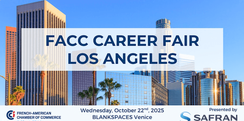 Vous chezchez un emploi ou vous souhaitez développer votre réseau à Los Angeles ? Mercredi 22 octobre, la Chambre de commerce franco-américaine de Los Angeles, la FACC California SF-LA, organise sa première Career Fair, de 4pm à 8pm chez Blankspaces à Venice. L’occasion de rencontrer des recruteurs, de networker, et de découvrir l’écosystème franco-américain de Los Angeles.