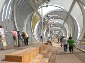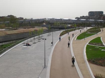Figure centrale de cette vitrine à ciel ouvert : le Pont d'Arganzuela. Telles deux hélices en métal enroulées l'une dans l'autre sur 278 mètres et brisées en un point, il est l'œuvre du Français Dominique Perrault. Sa deuxième réalisation dans la capitale madrilène, après le Centre de tennis olympique du parc Lineal del Manzanares. Et la "plus emblématique" des 35 passerelles construites ou réaménagées, affirme le maire de la Ville.