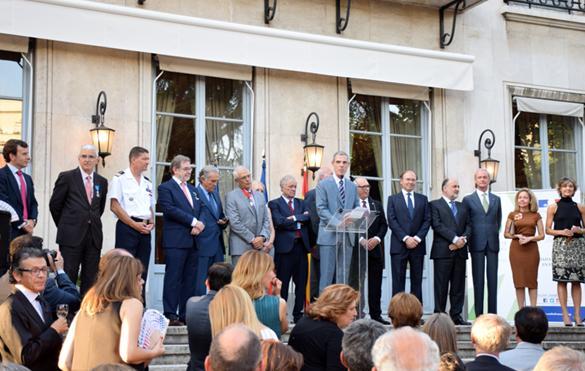 Jérôme Bonnafont, Ambassadeur de France en Espagne et amphytrion de la cérémonie, après avoir adressé ses félicitations aux décorés du 14 juillet, s'est adressé à l'assemblée en espagnol puis en français, pour rappeler que le 14 juillet commémore deux événements: la conquête de la Liberté et la création de la Nation. Il a ensuite souligné que l'année avait été particulièrement riche, avec deux sommets franco-espagnols très importants, la Visite d'Etat en France du Roi et de la Reine d'Espagne, et la croissance des exportations.