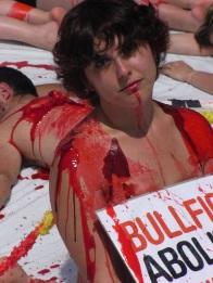 Près de quatre cent personnes se sont adonnées hier, devant la Plaza de Toros de Ventas, au simulacre de la mort du taureau. Organisé par l'association Equanimal, ce « happening » visait à dénoncer les souffrances endurées par l'animal au sein de l'arène