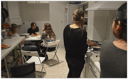 Le réfrigérateur, la salle de bain, les placards, la cuisine. À huit dans un appartement, il faut savoir s'organiser. Agathe, Française de 26 ans, vivant dans l'appartement depuis plus d'un an, l'explique : "L'organisation s'est mise en place facilement et nous n'avons jamais, ou presque, de difficultés pour partager les espaces communs. Chacun a son rythme, ses horaires, ses activités. Et tout cela se goupille au final assez bien". Trouver une place dans le réfrigérateur, un placard de vide pour sa nourriture, un moment de libre pour lancer une machine à laver. Donner cinq euros par mois pour les achats communs, attendre que la cuisine se libère un peu pour se préparer à manger. Une vraie organisation à élaborer. Le point le plus épineux reste le ménage : (heureusement !) chez nous, une femme de ménage passe chaque semaine pour nettoyer les parties communes.
