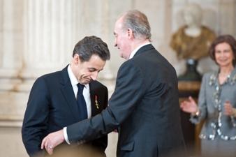 Remise de la Toison d'or au Palais royal, en présence des quatre derniers présidents du gouvernement espagnol Au cours de son discours, le roi Juan Carlos a d'abord vanté la "longue et brillante carrière politique" de Nicolas Sarkozy. Avant de s'adresser directement au chef de l'Etat français : "Votre carrière se caractérise par deux qualités essentielles : la hauteur de vue et la capacité à l'action. (...) Si en ce début de XXIe siècle, nous pouvons affirmer que les relations entre la France et l'Espagne n'ont jamais été aussi bonnes au cours de notre histoire commune, c'est en grande partie à vous, grand ami de l'Espagne, qu'on le doit." Visiblement touché lors de la remise du grand collier, Nicolas Sarkozy avait du mal à cacher son émotion au moment de s'adresser à l'auditoire. "Croyez bien que c'est un jour que je n'oublierai pas." Conscient de l'importance attribuée en Espagne au renoncement de l'ETA à la lutte armée, le Président a rappelé son engagement de 2002 : "Il n'y a plus de Pyrénées dans la lutte contre le terrorisme. Il y a des deux côtés de notre frontière une même détermination et un même objectif : mettre un terme définitif à la violence aveugle."