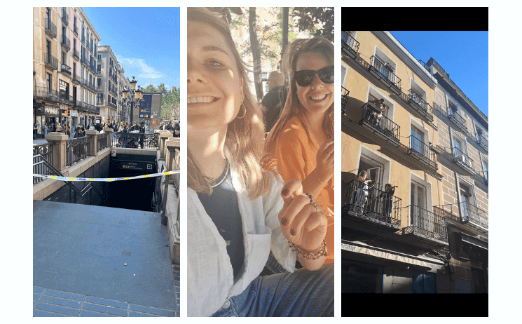 Sur le chemin, j’ai croisé une amie avec qui j’ai improvisé une balade au parc, dans un Madrid méconnaissable : voitures avançant sans feux, touristes perdus dans les rues, files d’attente devant les rares magasins encore ouverts, voyageurs bloqués, groupes d’amis et de collègues réunis au parc ou en terrasse. Peu à peu, l’inquiétude initiale s’est transformée en une forme de légèreté inattendue : concerts de rue, rires partagés, écoute groupée de la radio sur les trottoirs… Malgré tout, Madrid restait joyeuse, vivante, et profondément humaine.