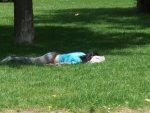 "Oui, j'étais couchée mais je ne faisais pas la sieste ! Que j'aimerais pouvoir la faire ! Mais comme je travaille près d'ici, en été, je profite du parc pour me reposer. Je m'allonge un moment, une demi-heure, mais je ne dors pas. Ça n'est pas une sieste ! Faire la sieste, c'est dormir !"