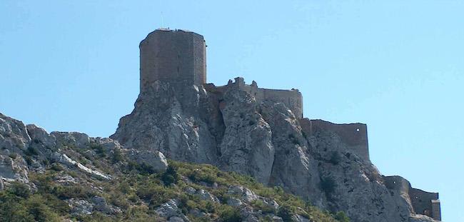 Quéribus est l’un des plus impressionnants châteaux cathares, à cheval sur une crête des Corbières, surveillant la frontière aragonaise du Moyen-Âge. Le paysage de cette forteresse est unique, vraiment impressionnant, comme suspendu en plein ciel, entouré d’abîmes. Depuis le château, on découvre au nord les Corbières, vieux massif regorgeant d’histoire. Au sud, la vallée du Maury, les bois des Fenouillèdes en premier plan, les Pyrénées et le mont Canigou derrière. Et au loin, à l’Ouest, la Méditerranée. Tout cela balayé par la tramontane éternelle.