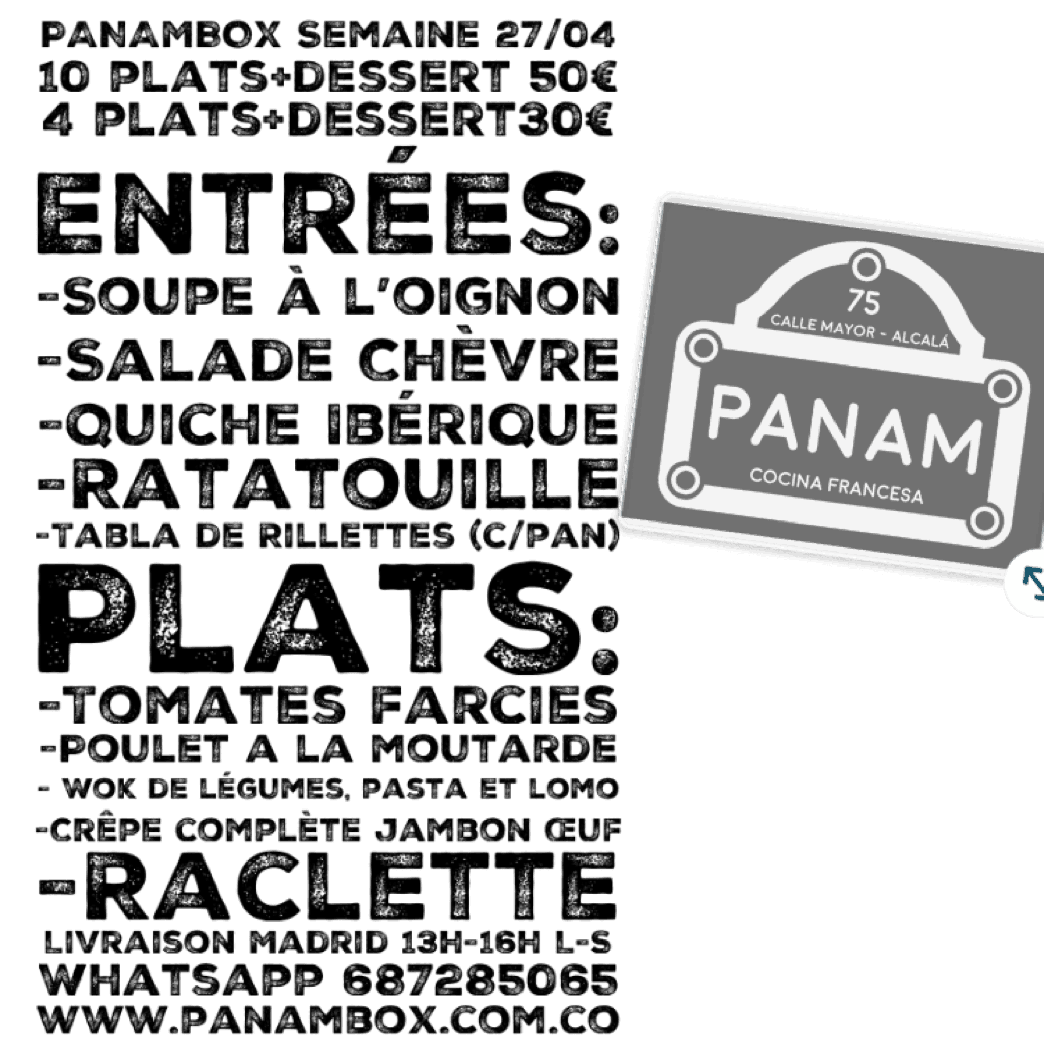 Nous collaborons avec l'ALI et l'APA du Lycée français et le groupe Facebook Français à Madrid qui nous ont gentiment permis de publier notre menu avec une très bonne acceptation de la part de nos clients vu la variété, et le rapport qualité prix de notre PANAMBOX…
