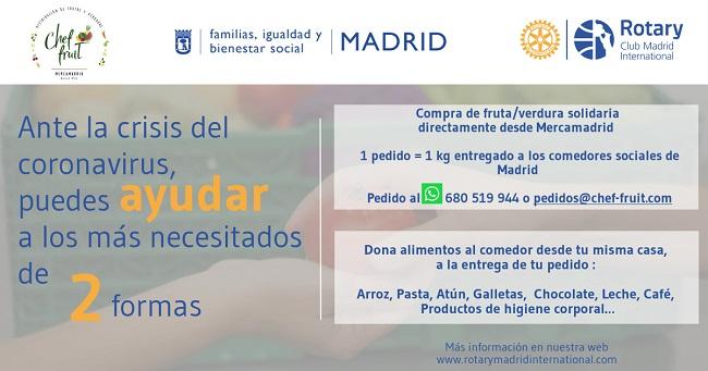 Pour faire face à la crise provoquée par Covid-19, voilà une belle initiative qui permet d’être solidaire avec les personnes les plus vulnérables tout en restant confiné chez soi. Le Club Rotary Madrid International et la Mairie de Madrid ont établi un accord avec l’une des entreprises de MercaMadrid, "Chef Fruit Home", qui livre des fruits et légumes aux particuliers, pour contribuer à donner à manger à des familles sans ressources.