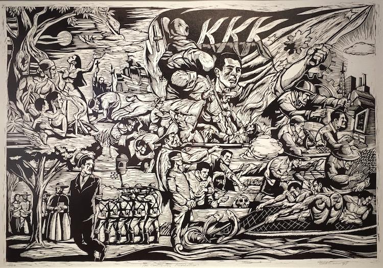 9- et 10- Le Musée national des Philippines propose deux superbes EXPOSITIONS TEMPORAIRES : la rétrospective de Pierre de Vallombreuse, déjà évoquée dans nos colonnes (consulter cet article) et la présentation de nombreuses gravures de Leonilo O. Doloricon, "Handog sa Bayan", travail aussi noir que puissant, dénonçant, dans un langage plastique nourri à des sources diverses (de la caricature de presse au graphisme des comics américains), les injustices et les violences de la société philippine contemporaine. Une exposition choc à découvrir au dernier niveau du musée jusqu'au 24 septembre prochain.