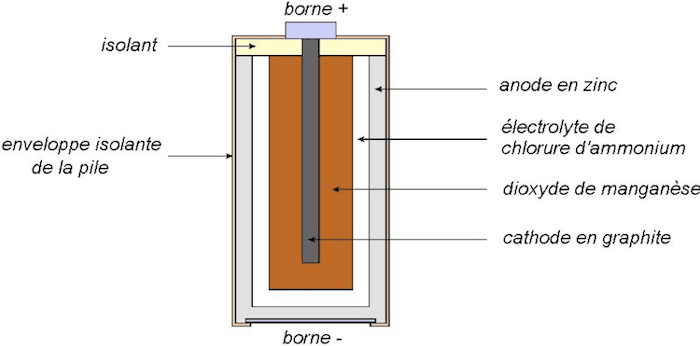Le schéma ci-dessus montre en détail la structure d’une pile. Le boîtier, souvent en acier, recouvre la totalité des contenus.