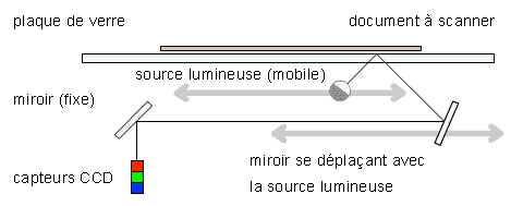 Une source de lumière mobile se déplace le long du document à scanner afin d’éclairer le document à travers une vitre transparente. Cette dernière est "suivie" par un miroir qui permet l’envoi de la lumière aux capteurs CDD.