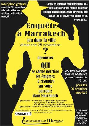 Mais le "crime"ne serait pas parfait sans un jeu de fin limier : le 25 novembre, la ville de Marrakech devient le cadre d'une enquête menée par des participants de 15 ans minimum qui, de lieu en lieu, devront défaire les fils de l'énigme? et peut-être gagner un week-end au Club Med d'Agadir et quelques ouvrages.