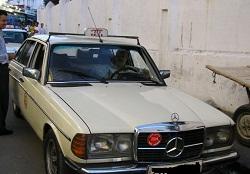 C'est un taxi, moutarde à Marrakech, blanc à Casablanca, chaque ville sa couleur, chaque taxi sa Mercedes, des Mercedes 240 D dont le dernier modèle est sorti des chaines en 1984. 27 ans qu'elle roule, qu'elle transporte au gré des routes et des pistes jusqu'à six personnes plus le conducteur. Elle s'arrête n'importe où, pour descendre ou faire monter des passagers, incontournable dans le paysage marocain, souvent qualifiée de "vache folle" ou de "requin blanc" à cause du non respect du code de la route.