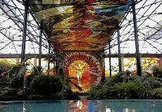 L'immense vitrail de Leopoldo Flores veille sur les plantes du jardin botanique. (Photo : Papelesdeviaje.com)