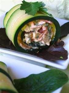 3. Placer 3 bandes de courgettes côté à côte, en les chevauchant légèrement, puis déposer la farce au milieu. Les rouler et les retenir avec des piques en bois.