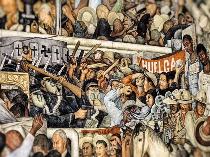 Comme vous pouvez l'observer de bas en haut, les différents moments historiques du pays y sont représentés de manière chronologique. Il y a tout d'abord la Conquête avec les soldats espagnols qui luttent contre les guerriers aztèques, vêtus comme des tigres ou des aigles. On peut voir au-dessus l'époque de l'évangélisation des populations indigènes avec les excès que cela impliquait. On aperçoit dispersés à droite à gauche les grands héros nationaux comme Miguel Hidalgo y Costilla, Maximilien de Hasbourg qui profita peu de temps de son empire, Porfirio Díaz et les révolutionnaires comme Zapata et Pancho Villa.
