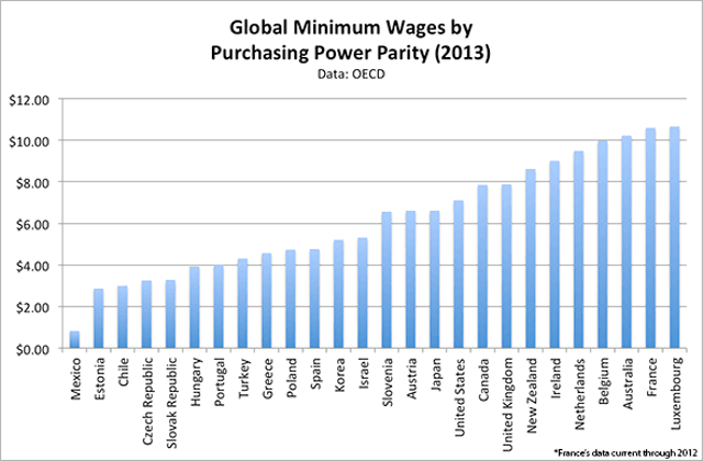 En 2013, le salaire minimum horaire mexicain avoisinait 0,50 dollar. Avec 3 dollars de l'heure, les salaires chiliens sont 6 fois plus élevés et les salaires américains 14 fois plus élevés. (Source OCDE)