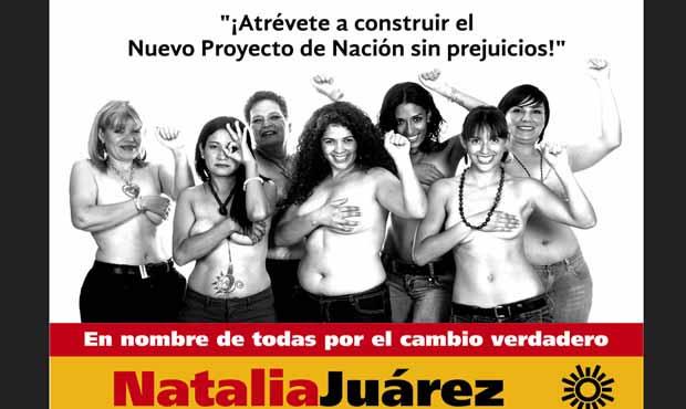 Natalia Juarez, candidate du Parti de la Révolution Démocratique (PRD) à la Chambre des Députés pour l'Etat de Jalisco, a décidé d'entamer une campagne "provocatrice". Opposée aux deux hommes politiques les plus connus de l'Etat de Jalisco, Jorge Salinas Osornio (PAN) et Leobardo Alcada Padillan (PRI), la candidate de 34 ans et professeur de philosophie à l'Université de Guadalajara veux marquer les esprits. "Je souhaite faire une campagne différente et joyeuse" , affirme-t-elle. C'est pourquoi on peut la voir actuellement en photo dans les rues de Guadalajara, tout comme les six autres femmes qui l'accompagnent sur l'affiche du PRD, se cachant la poitrine avec la main droite et levant la main gauche sous le slogan "Oses construire le nouveau projet de la nation sans préjugés !". Mais c'est aussi, et Natalia Juarez ne s'en cache pas, parce qu'elle ne dispose pas de gros moyens pour faire parler d'elle. Elle a d'ailleurs annoncé lancer, pour la seconde phase de sa campagne, une autre série de photos "polémiques".