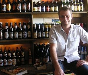 Bastien, tout sourire, devant une sélection de bières belges et allemandes