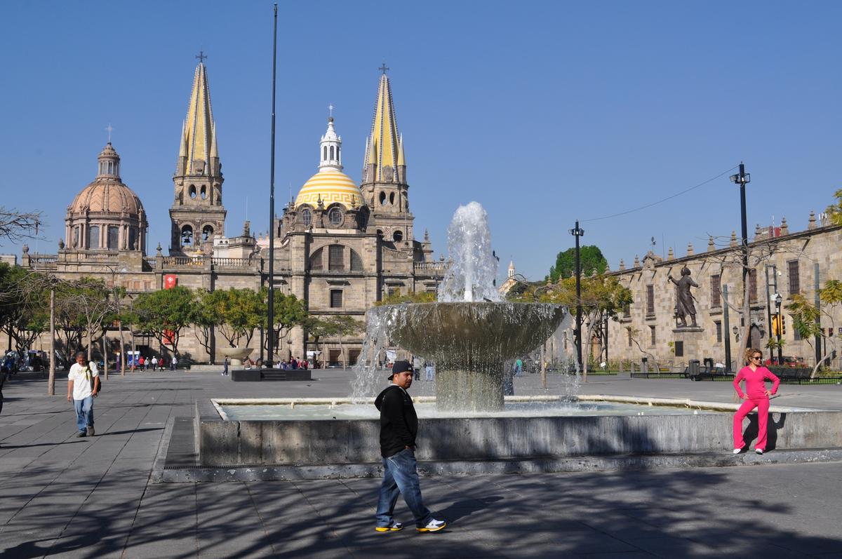 Devant la cathédrale donc, la Plaza Guadalajara où trône une fontaine qui rappelle les surnoms de cette agglomération de plus de 4,4 millions d'habitants : la Perle d'Occident ou la Ville des roses. Sur la gauche, la Plaza de Armas où se trouve un joli kiosque Art nouveau ? cadeau de Porfirio Díaz en 1909 ? dont les statues de femmes dénudées étaient recouvertes la nuit par les bigots de l'époque. Sur la droite, la Rotonda de los Jalisciences ilustres rend elle hommage par des sculptures en bronze, depuis 1952, aux grands natifs du coin comme le peintre José Clemente Orozco, l'un des trois plus fameux muralistes du Mexique avec Diego Rivera et David Alfaro Siqueiros. Enfin, située derrière la cathédrale, la Plaza de la Liberación, cernée par los Palacios de Gobierno (dans lequel le curé hidalgo décréta l'abolition de l'esclavage), Legislativo et de Justicia, parachève cet ensemble architectural.