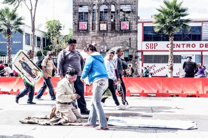 Sur le terre-plein central de la calzada de Guadalupe, à Mexico, un alignement de dalles en marbre est empruntée par les fidèles les plus croyants. Cela fait plus de 3 heures que Yasmin avance à genoux. Afin de les protéger un peu, ainsi que ses mains, son époux pose des bouts de carton sur le chemin. Leur fille de 2 ans et 10 mois souffrait de convulsions. La jeune mère a alors fait une promesse à la Vierge de Guadalupe. En cas de guérison, elle viendrait la remercier de la sorte. La petite étant selon eux en meilleure santé actuellement, Yasmin tient donc sa promesse.