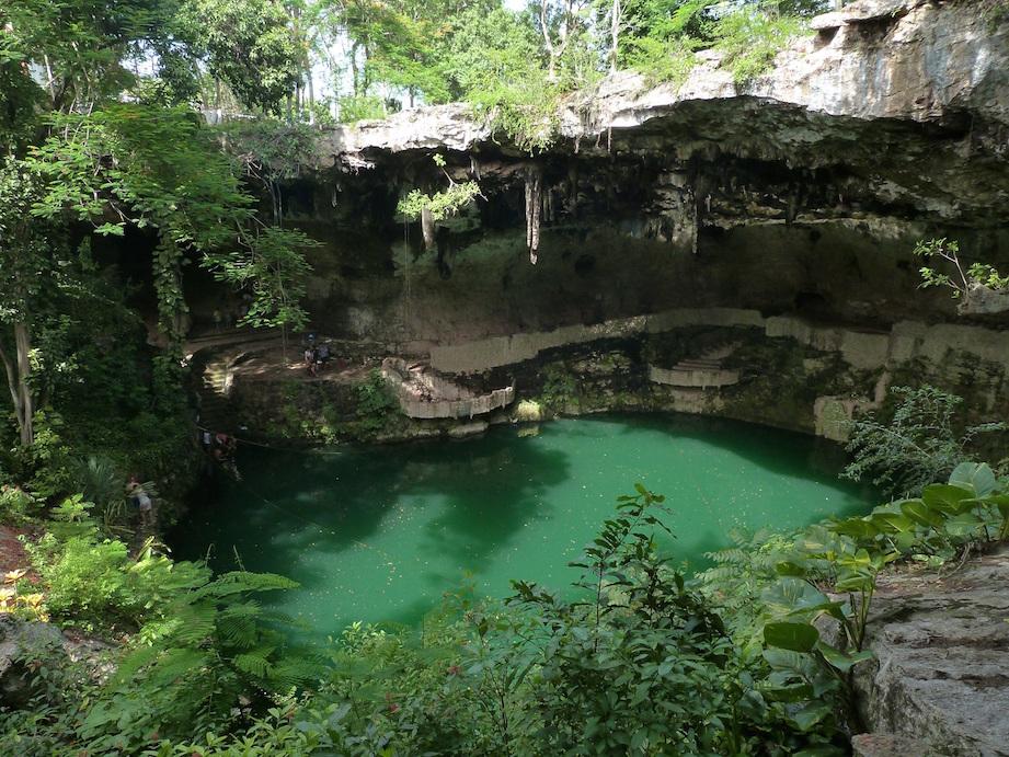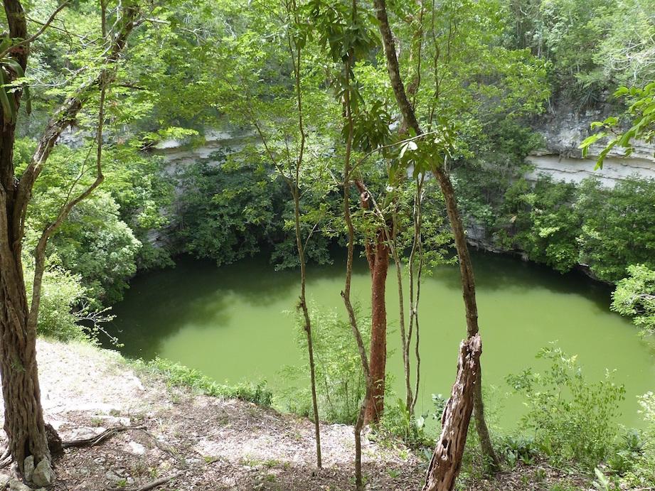 cenote sagrado dont les parois sont couvertes de lianes et de végétation. Il cumule un diamètre de 60 mètres et une profondeur de 35 mètres. Les expéditions de plongeurs ont permis de découvrir des centaines d'objets, bijoux? et ossements humains ! C'était en effet un lieu servant aux sacrifices humains (souvent de jeunes enfants) pour envoyer ces messagers dans l'infra-monde afin de contenter les divinités mayas. Le