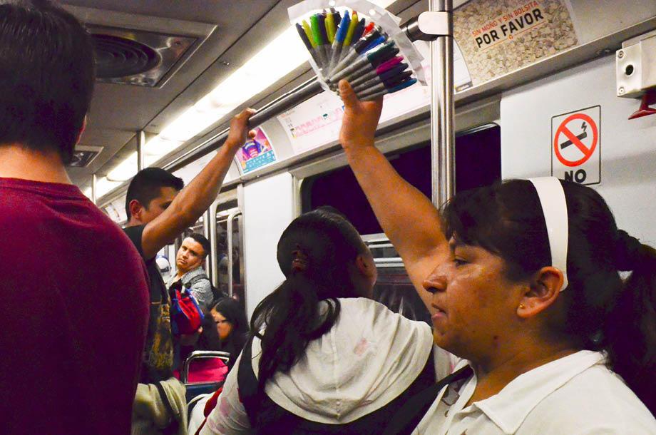 Cette agitation souterraine a de quoi fatiguer, mais elle a aussi son charme... et peut s'avérer fort pratique ! Si les couloirs du métro chilango représentent à eux seuls une immense caverne d'Ali Baba, où tout se trouve et tout se vend, des tacos de canasta à la robe en passant par le tatouage ou les churros, les wagons du métro eux-mêmes sont loin d'être exempts de tout trafic. A toute heure et partout (à l'exception de la ligne 12, où la musique lounge et le zouk-love caribéen ont remplacé les vendeurs interdits de séjour), les compartiments du métro sont sillonnés dans les deux sens par les vendeurs ambulants, reconnaissables à leur banane-porte-monnaie plus ou moins pesante et à leurs handshake complices. Charge à ces véritables maîtres des lieux de vous vendre en un temps express la marchandise (bon marché) du jour, quelle qu'elle soit. Pour faire votre marché sans marcher, prenez le métro !