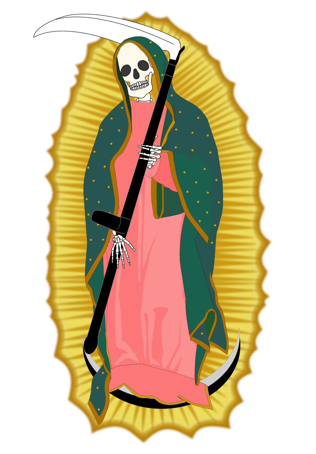 La Santa Muerte est habillée de manière beaucoup plus sombre et macabre, elle porte une faux et une tunique colorée qui lui couvre la tête, ainsi qu'une couronne. Elle personnifie la morte de manière similaire à la Grande faucheuse dans les folklores européens.