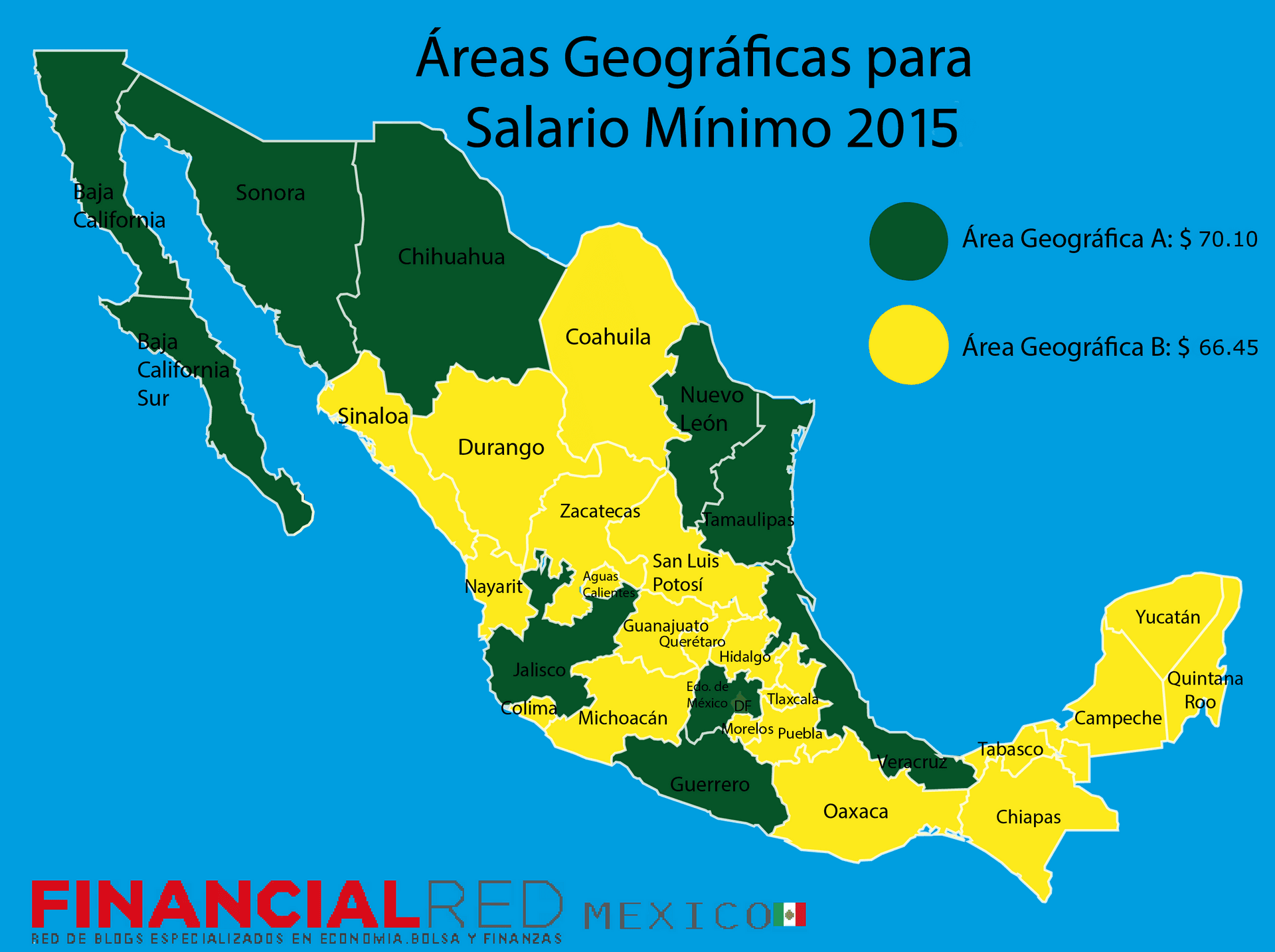 Jusque là, le Mexique était divisé en deux zones économiques, la B avec un salaire minimum de 66,45 pesos et la A avec un salaire de 70,10 pesos. L'établissement d'une zone unique représentera donc une augmentation salariale d'environ 5,49% pour la zone géographique B, qui regroupe les Etats d'Aguascalientes, Campeche, Coahuila, Chiapas, Durango, Guanajuato, Hidalgo, Michoacàn, Morelos, Nayarit, Oaxaca, Puebla, Querétaro, Quintana Roo, San Luis Potosi, Sinaloa, Tabasco, Tlaxcala, Yucatàn et Zacatecas.