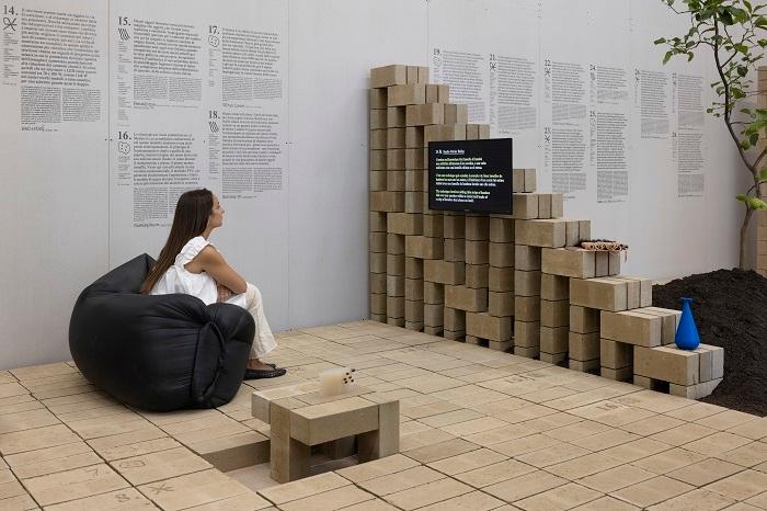 La scénographie de la Section française est entièrement faite de briques, 2024 au total, réparties dans un espace de 90 m². Toutes ont été produites à Milan avec une terre locale, par l’architecte spécialisée en terres crues, Pietro Degli Esposti. Et toutes seront ensuite réemployées pour un aménagement pérenne.